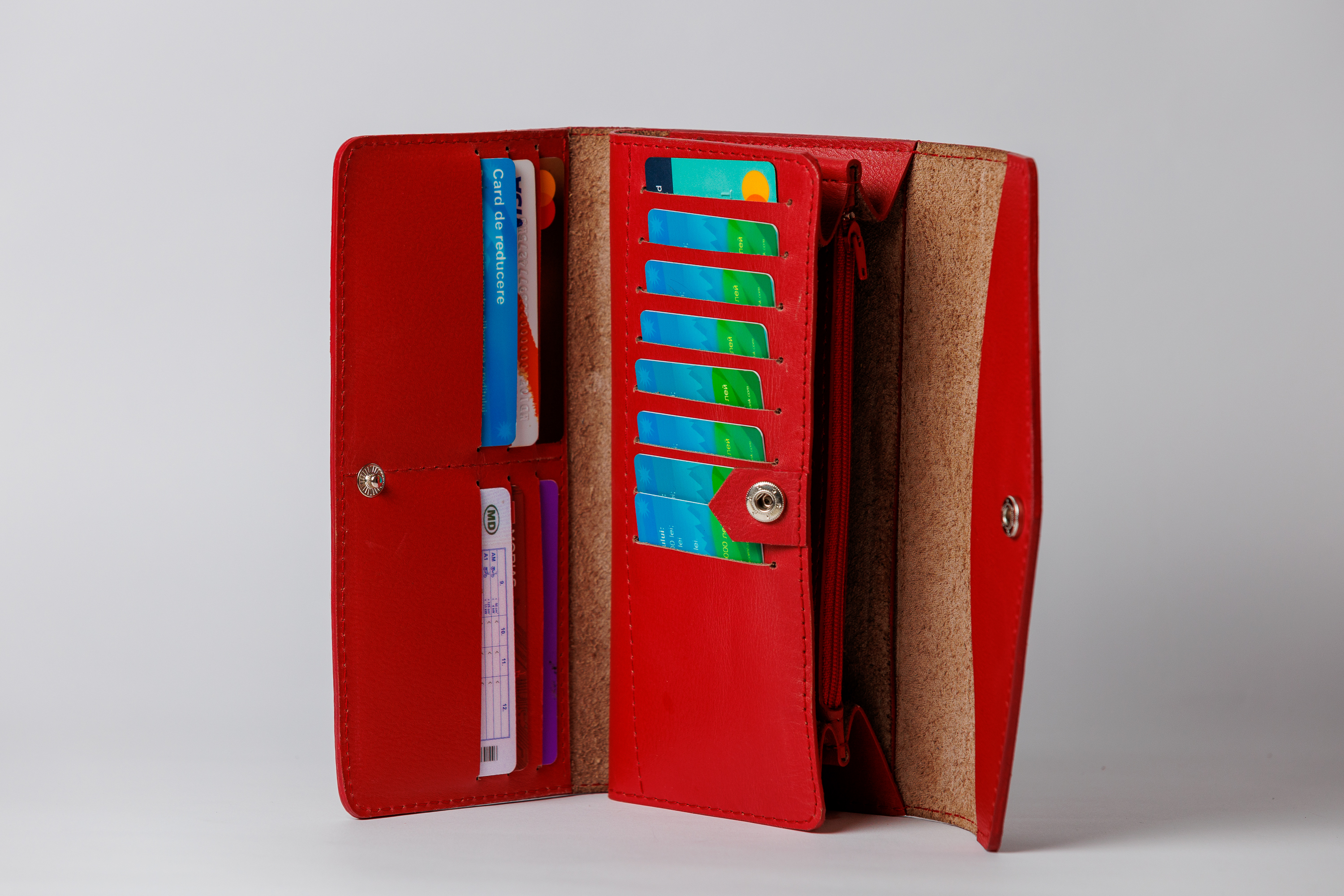 Cardurile sunt separate într-un compartiment închis cu buton, îl deschizi doar când ai nevoie.